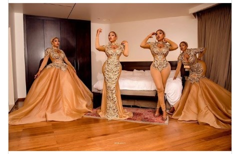 The gold-coloured dress with heavy applique around the bustline downwards shows Lawani rocking it as a ball gown, a fit-and-flare dress, as a catsuit and then as a mermaid dress.