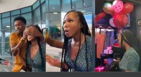 A giant Cake, a bouquet of flowers, red ribbons, designer bags, nice expensive dresses, high heels, boxes of presents and balloons could be seen in the video as Neo literally left Vee in so much disbelief at what she’s seeing.