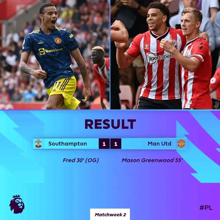 Manchester united were held to a disappointing 1-1 draw against Ralph Hassuhenti’s Southampton at the Saint Mary’s stadium on Sunday afternoon.