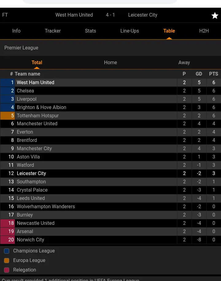 Both Chelsea and Liverpool have scored five goals each in their first two league games of the season. The reds won 3-0 at Norwich, while Chelsea also defeated Crystal Palace at home with the same scoreline. Liverpool also defeated Burnley by two goals to nothing on Saturday, while Chelsea defeated Arsenal by the same scoreline on Sunday, meaning they both have six points from two games with a goal difference of plus five goals each. What gives West ham United an edge over them is the fact that the Hammers have scored Eight goals in two games, having defeated Newcastle United by a scoreline of 2-4 and then Leicester by a scoreline of 4-1, meaning that David Moyes men now have six points from two games, with a goal difference of plus five.
