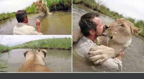 A man, Kevin Richardson, had taken it upon himself to go see the lions he had rescued 7 years ago According to Kelvin who operates a lion park, he had cared for the cubs when the mommy lion rejected them In a video capturing the reunion, he met the lions in the water and received surprise hugs and kisses from one of them