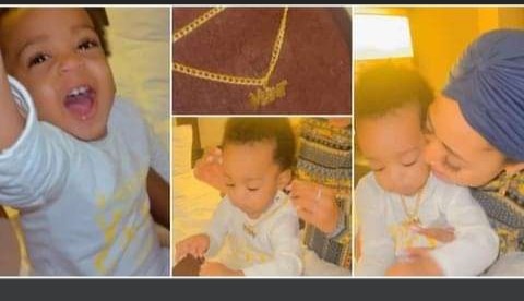 Regina Daniels Gifts Son Munir Customized Gold Necklace in Adorable Video