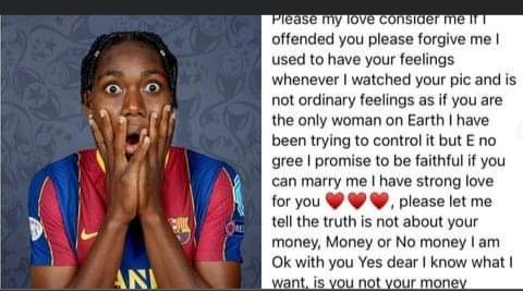 Asisat Oshoala received an emotional letter from an unidentified man who has professed his undying love for her The ‘lover’ asked for the Super Falcons’ striker’s hand in marriage as he promises to be faithful to her at all times He added that her money is not what he wants, emphasising that he feels different anytime he sights her picture