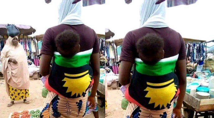 The woman was backing her baby with the Biafra cloth while at a market in Katsina state.