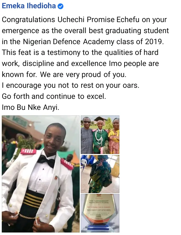 Meanwhile, the former governor of Imo State Mr Emeka Ihedioha has taken to his verified Facebook page to congratulate the eloquent cadet on her well deserved award.