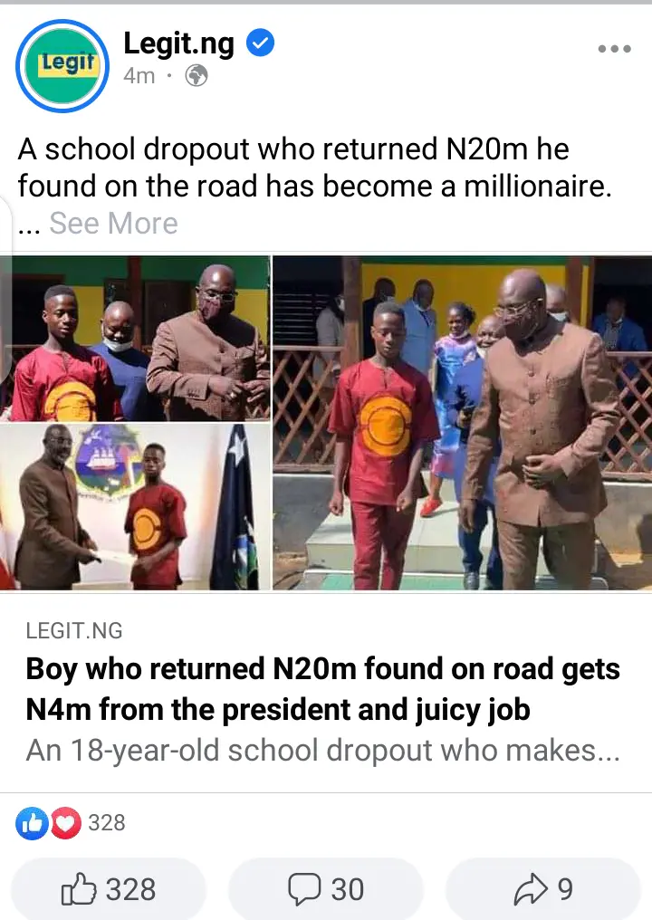 The President of Liberia, George Weah personally recognized his honest deeds, so that other people like him would emulate and do the same if face with the same situation.
