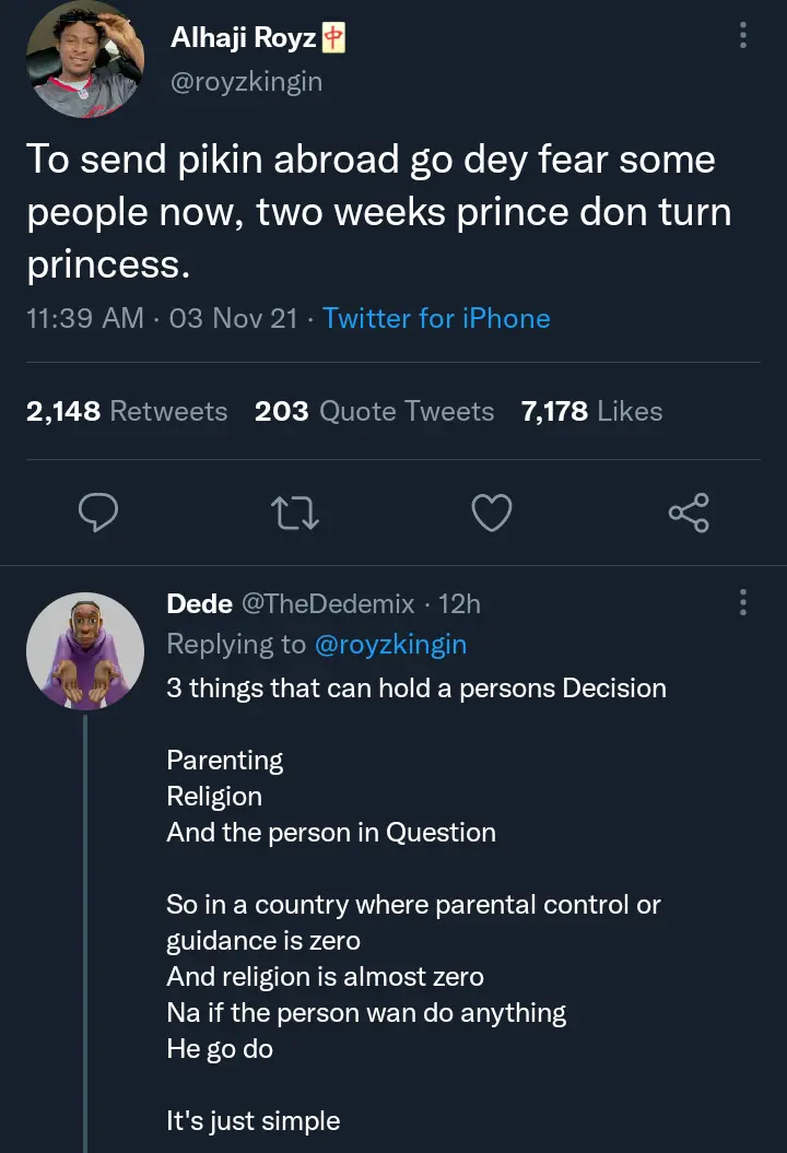 It is clear from all indication that the lady /man came from a very religious family, judging from the mother’s statement and messages she sent to him/her. One of the people helping the mother pray for the child said, “Been in this abroad for 8yrs, and have never changed from being good. Some people are just waiting for the opportunity. It’s them, not the system. And some people choose to follow suits when they travel abroad because in their system the likes of that is allowed”.
