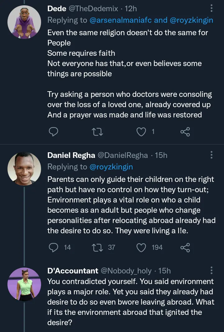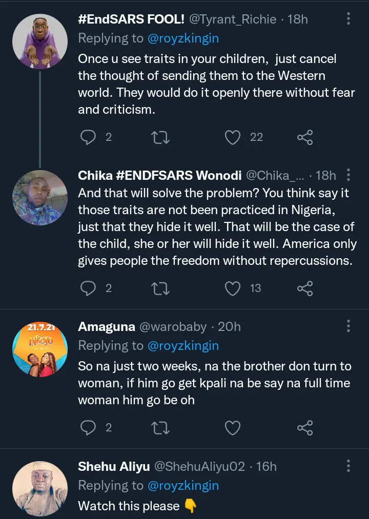 It is still unclear why the man decided to turn into a woman, but he /she is very comfortable with his /her present condition. He /she was even embarrassed and angry that his/her mother called him/her a man. The incident was said to have taken place in Nigeria. A Twitter user wrote, “Parents can only guide their children on the right path but have no control on how they turn out; Environment plays a vital role on whom a child becomes as an adult but people who change personalities after relocating abroad already had the desire to do so. They were living a lie”.