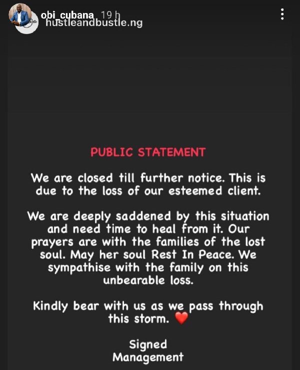 Businessman, Obi Cubana has temporarily shut down his Abuja club, Hustle and Bustle after a female client was allegedly electrocuted in the club.