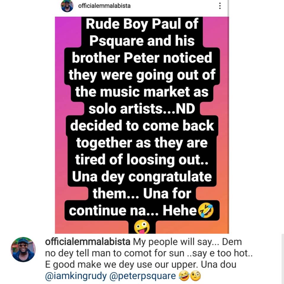 Rude Boy Paul of Psquare and his brother Peter noticed they were going out of the music market as solo artists…anddecided to come back together as they are tired of losing out.. Una dey congratulate them… Una for continue na… Hehee