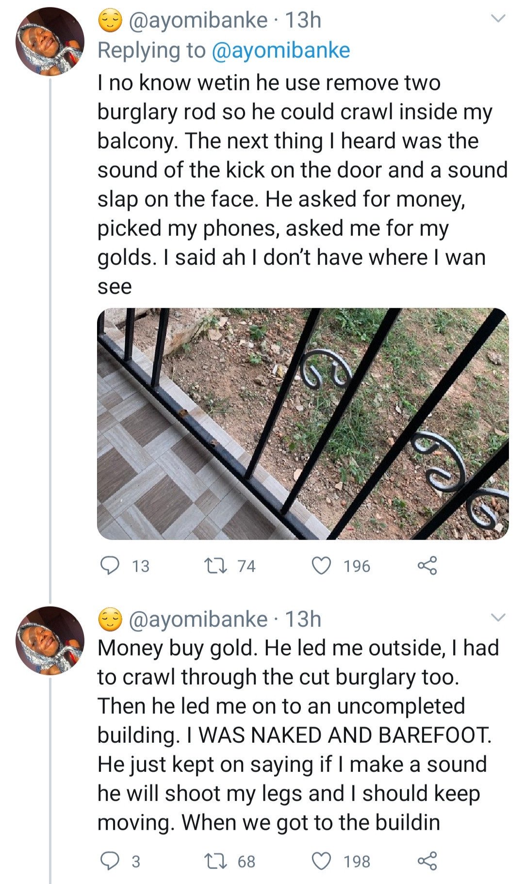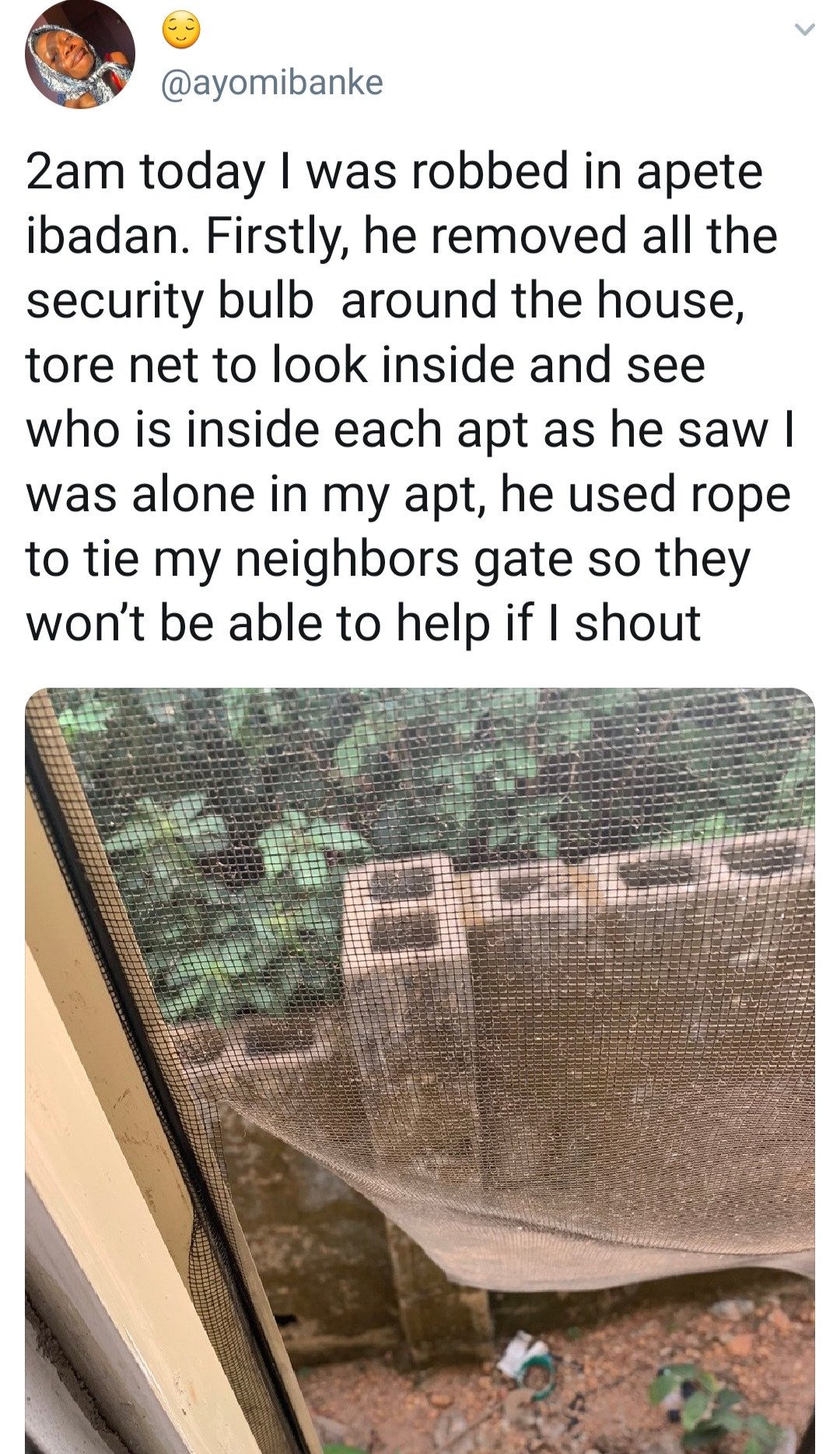 She revealed that the lone robber removed all the security bulbs around her apartment then tore the net of each apartment to peep in.