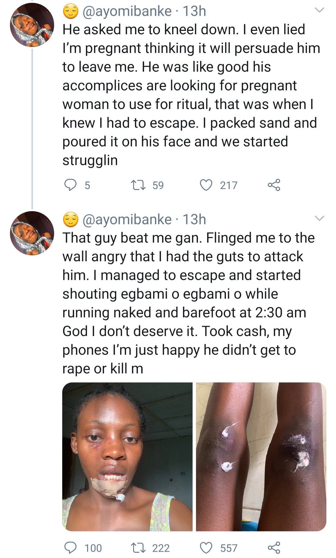 To get sympathy, she told him she was pregnant but he responded that his accomplices are looking for a pregnant woman to use for rituals.