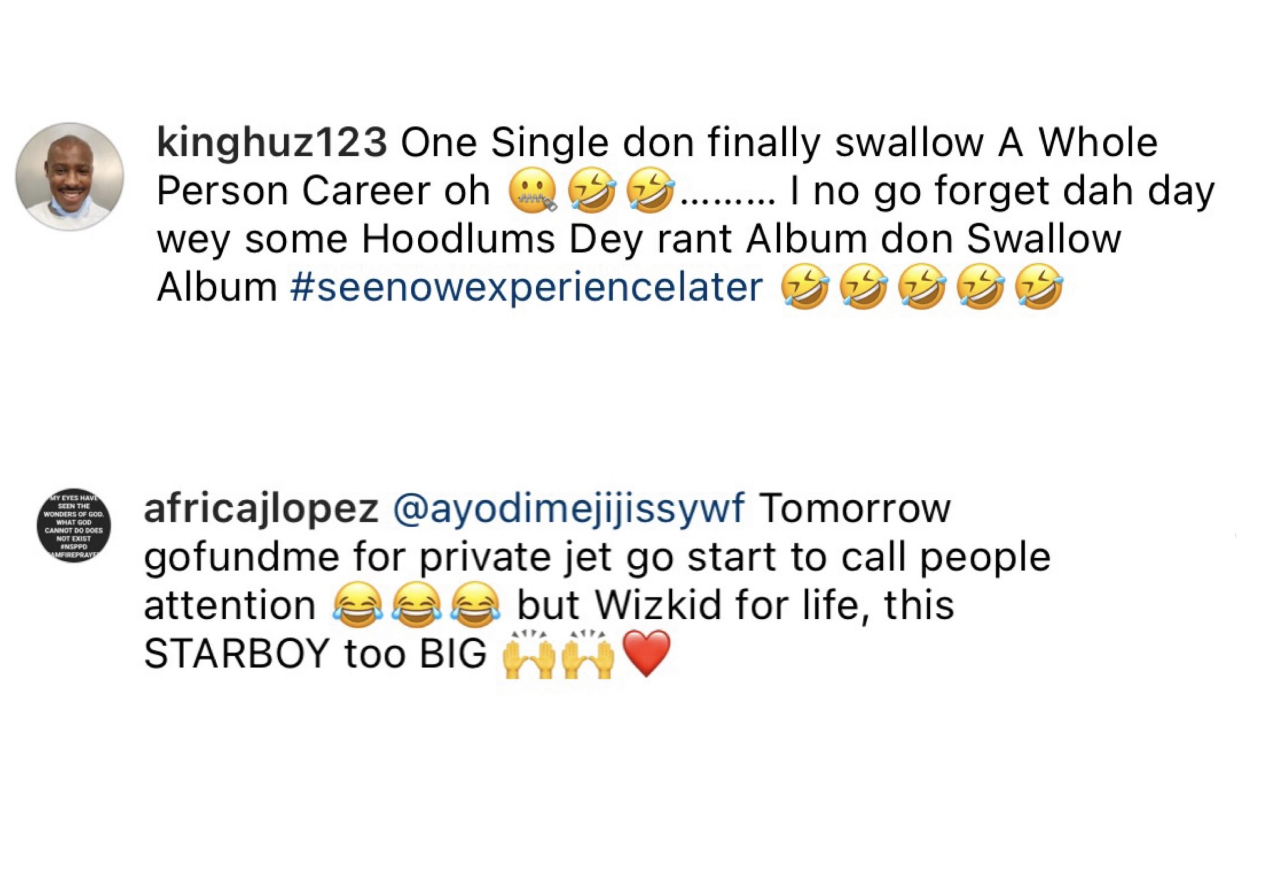 They also jubilated that Wizkid has ended Davido’s Career and advised Davido to continue with his go fund project and maybe ask for a Private Jet next time he ask.