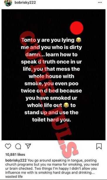 In response to this, Bobrisky also revealed that Tonto defecated on the bed twice after smoking and drinking herself into a stupor as she was so weak to even use the toilet.